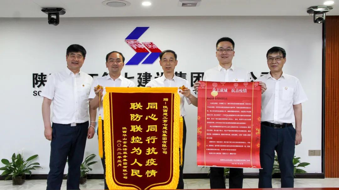 5月7日,陕西华山金生活服务集团副总经理徐信强一行向集团送来“同心同行抗疫情,联防联控为人民”的锦旗,对集团在疫情期间,积极助力抗疫表示感谢。集团党委副书记、工会主席赵全科代表集团接受锦旗。